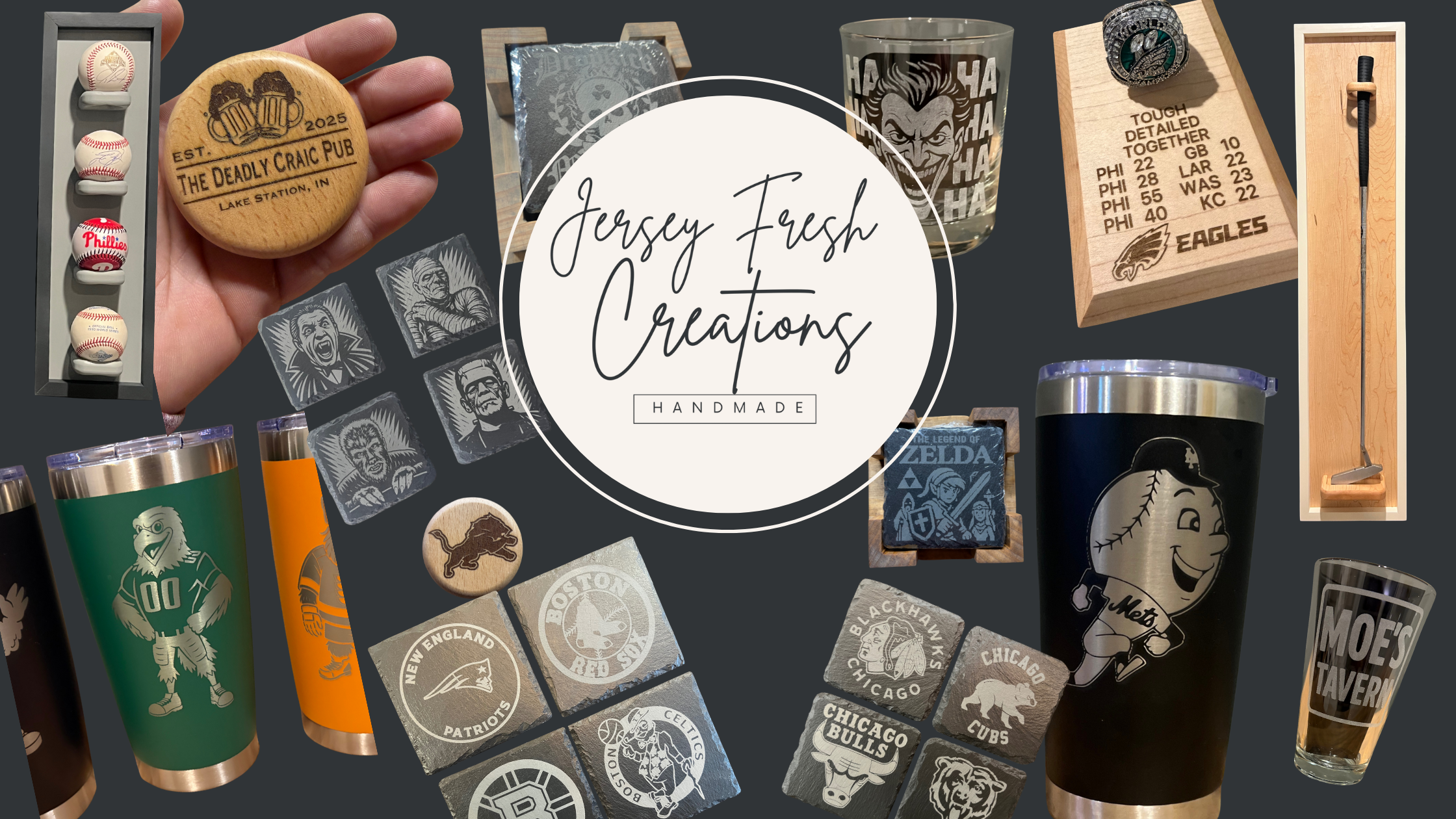 Jersey Fresh Creations specializes in engraved items such as glassware and coasters and other handmade goods.